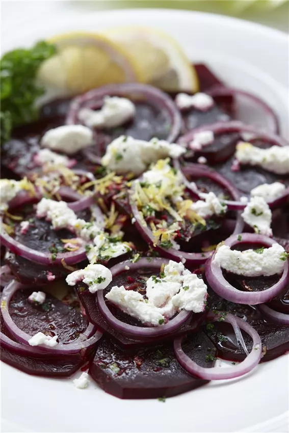 Die Zwiebel ebenfalls in Scheiben schneiden. Die Rote Beete auf einem Teller verteilen und die Zwiebeln darüber schichten. Von der Zitrone die Schale abreiben, zur Seite stellen und dann die Zitrone auspressen.