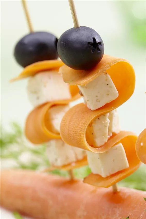 Fetakäse in kleine Würfel schneiden und die Oliven abwaschen. Dann wird alles auf die Spieße verteilt, auf jeden Spieß steckt man einen Karottenstreifen, drei Fetawürfel und eine Olive.