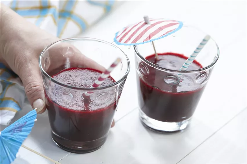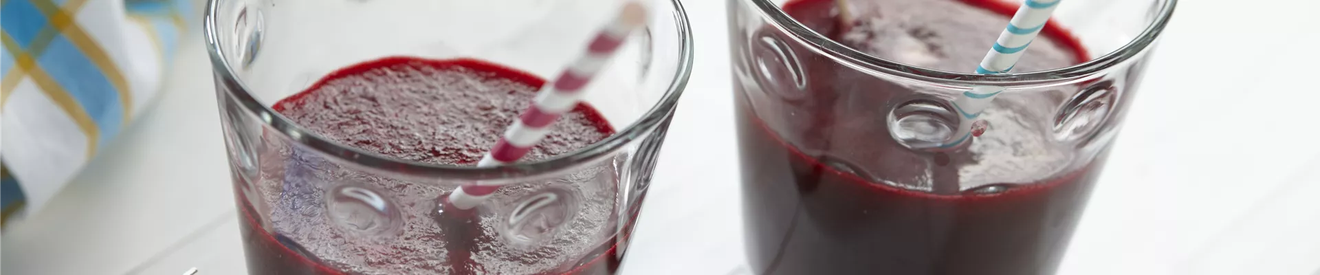 Rote Beete, Äpfel und Möhren waschen, schälen und halbieren. Dann alles nacheinander durch den Entsafter laufen lassen und in Gläsern anrichten.