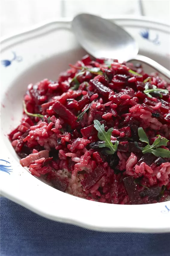 Etwas von der Brühe hinzugeben, bis der Reis leicht bedeckt ist, dieses nun solange verrühren bis alles eingezogen ist. Dies wird ca. 18 Minuten wiederholt, bis der Reis bissfest ist. Dann die Rote Beete und den Rest der Butter hinzugeben und ca. 4 Minuten weiterköcheln lassen.