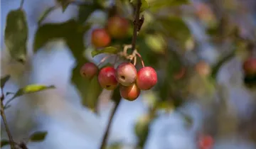 Besonders dekorativ sind die roten, runden Früchte von Malus x moerlandsii 'Red Sentinel'. Diese erscheinen ab September und sind klein. Haften sehr lange.