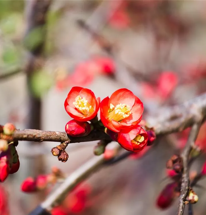 Die Niedrige Scheinquitte (Chaenomeles japonica) ist ein ausladender Kleinstrauch mit dekorativen, gelben, orangefarbenen, birnenförmigen Früchten. Diese verströmen einen angenehmen Duft. Die Blüten erscheinen je nach Sorte in verschiedenen Farben.