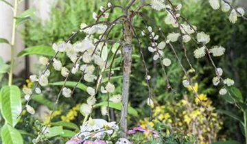 Die Hängende Kätzchenweide 'Pendula' (Salix caprea) ist ein überhängender Kleinbaum, der silbrige, in Kätzchen angeordnete Blüten mit einem leichten Duft hervorbringt. Sie erscheinen von März bis April. An einem sonnigen bis halbschattigen Standort mit durchlässigem, feuchtem bis nassem Boden erreicht sie gewöhnlich eine Höhe von ca. 1,5 m und wird ca. 1 m breit.