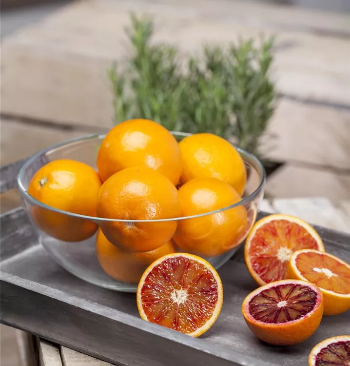 Citrus sinensis bildet orangefarbene Früchte mit einem süß-säuerlichen Geschmack. Reifezeit ab September.