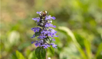 Ajuga reptans bildet lippenförmige, in Quirlen angeordnete, blaue Blüten ab April.
