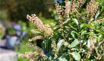 Die weißen Blüten der Portugiesischen Lorbeerkirsche erscheinen in Trauben von Juni bis Juli.