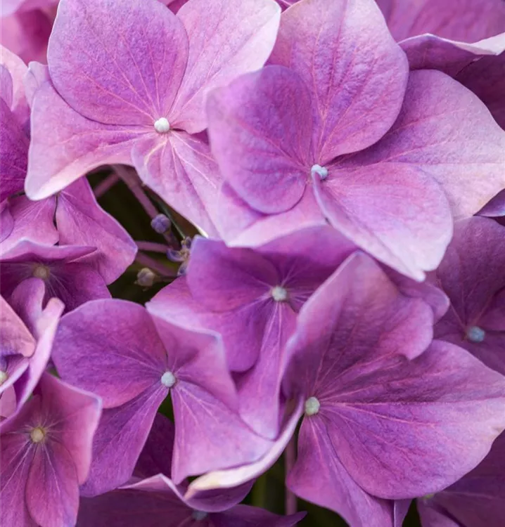 Die rosaroten, schalenförmigen Blüten der Bauernhortensie erscheinen in Dolden von Juni bis September.