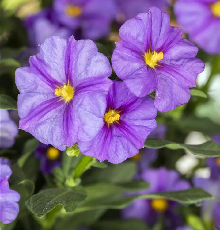 Solanum rantonnetii bildet während der gesamten Saison zahlreiche sternförmige, violette Blüten.